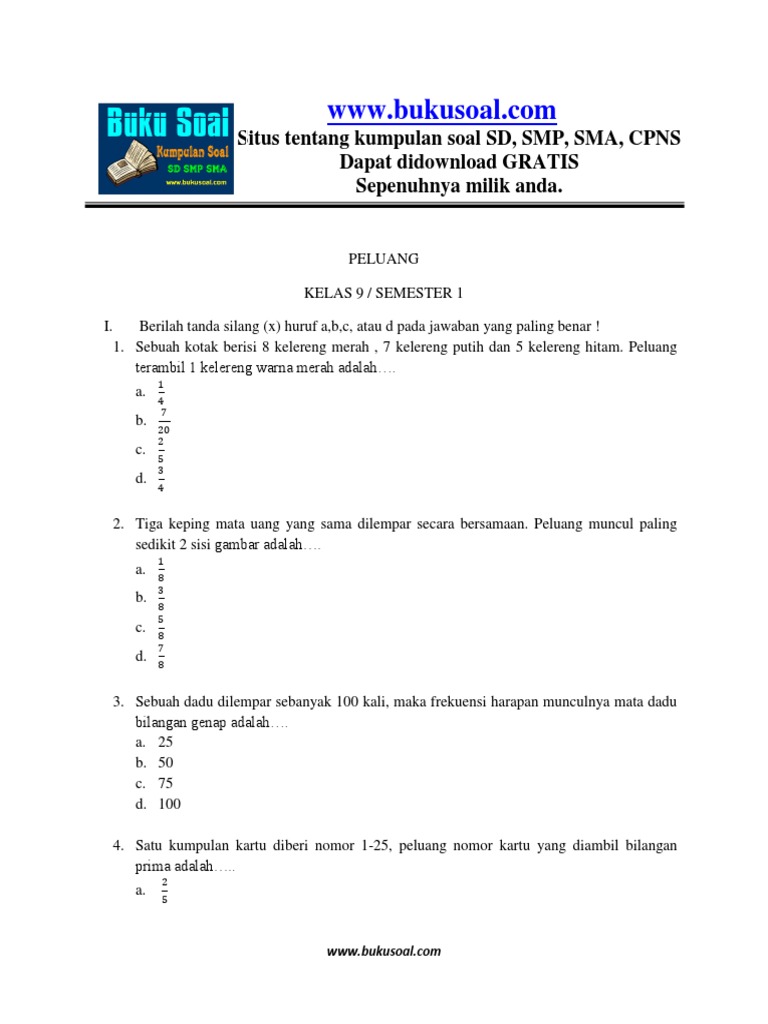 Contoh Soal Peluang Pilihan Ganda dan Jawaban [+Pembahasan] untuk Siswa SMP/MTs - Peluang atau kebolehjadian atau disebut juga sebagai probabilitas merupakan cara untuk mengungkapkan pengetahuan atau kepercayaan bahwa suatu kejadian akan berlaku atau telah terjadi.
